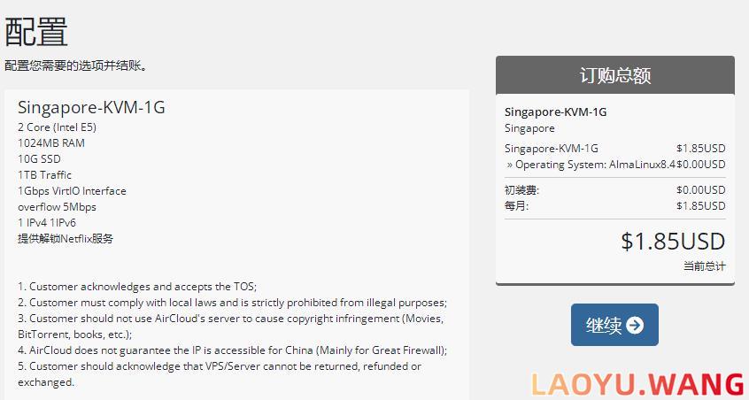 AirCloud,国内新商家,暂时仅提供KVM VPS,数据中心为新加坡和洛杉矶。下面是新加坡KVM VPS,无国内优化,提供DNS流媒体解锁。流量达到限额后限速5Mbps不停机。